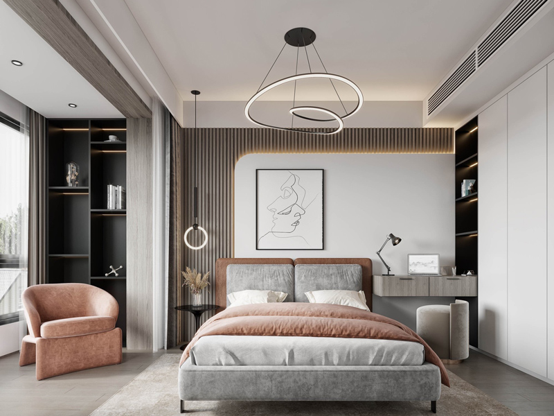 主卧大气时尚,增设飘窗与梳妆台,整体视觉更为饱满,为空间带来一份时尚与惬意,金属细节点缀灵动。