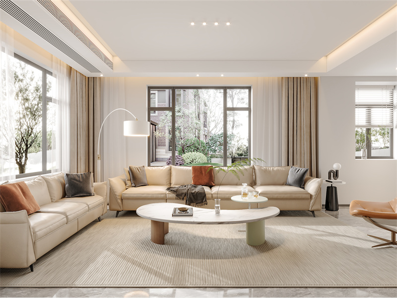 大面窗景引入户外绿意,浅棕沙发与异形茶几组合,传递松弛感。撞色抱枕、简约落地灯强化现代感,无主灯设计借线性光延伸空间,通透大气,展现设计巧思。