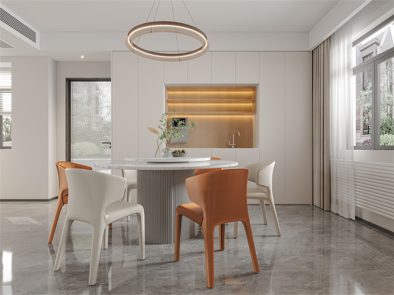 以现代简约为基底,开放式布局串联空间。圆形吊灯呼应圆桌形态,白棕配色营造温润氛围,撞色餐椅在统一中制造视觉焦点。嵌入式餐边柜结合线性光,既满足收纳又强化精致感。