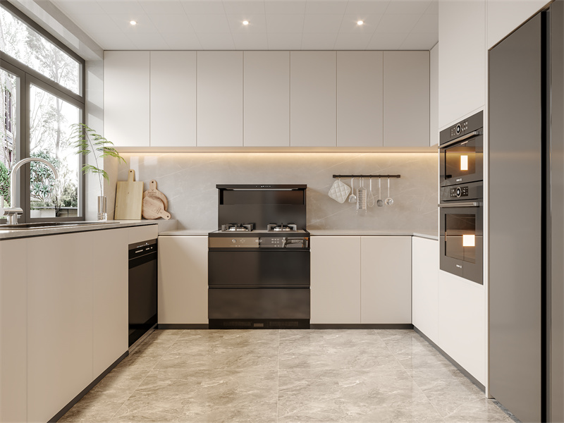 U型布局优化操作动线,浅白柜体与深灰电器、岩板墙碰撞,构建层次。隐藏灯带提升空间温馨度,开放挂杆、实用摆件平衡功能与美观,通过简洁形式+实用细节,打造便捷的烹饪环境。