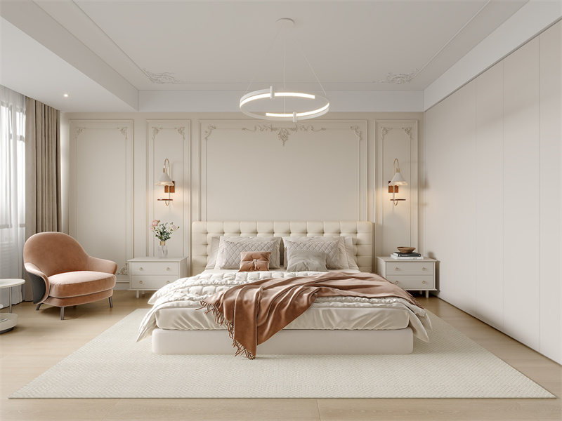 围绕“轻法式优雅”展开,雕花墙裙、弧形吊灯呼应经典元素,浅奶油色调营造柔和氛围。软包床头、撞色床品注入现代舒适感,构建兼具仪式感与松弛感的睡眠环境。