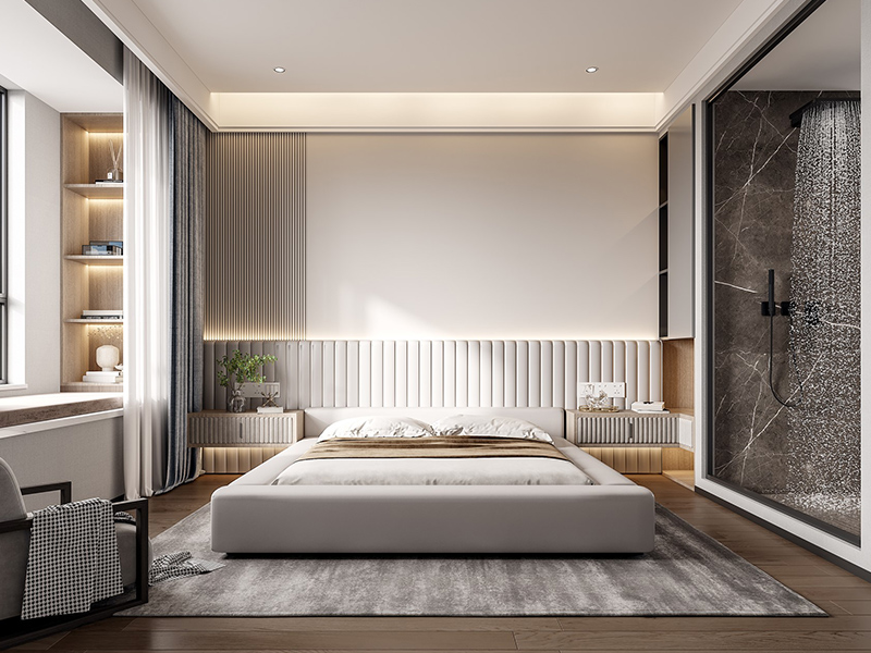 卧室空间设计合理,床居中摆放,两侧留空不局促。床头背景墙有线条装饰,增添层次感。窗边定制书架,营造阅读氛围,可睡前阅读放松。色彩以米色、木色为主,温暖柔和,打造出舒适惬意的休憩空间。