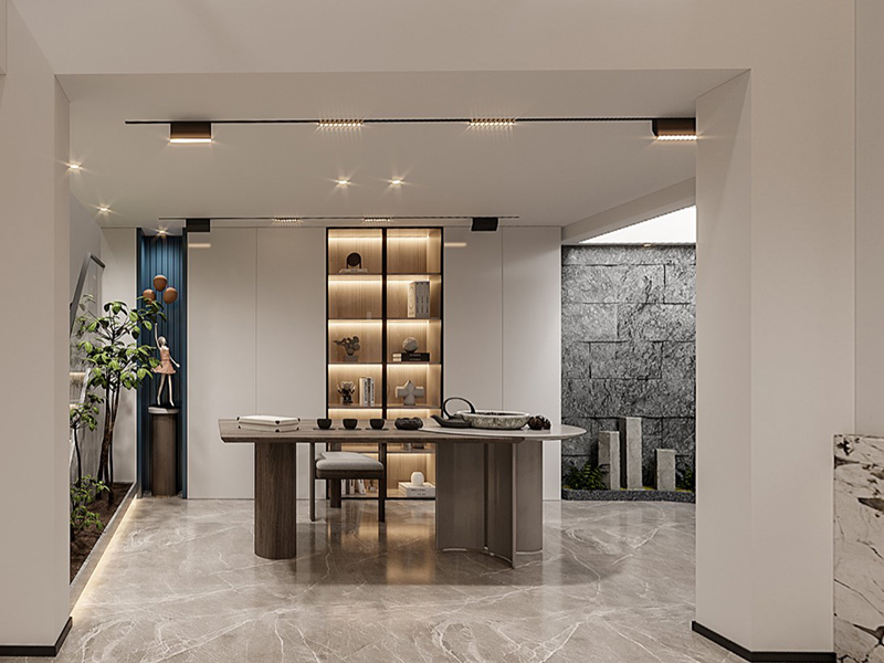 空间设计简洁大方。开放式布局让活动更自由,茶室与绿植区结合,营造出闲适的居家生活氛围。灰白主调搭配局部亮色,沉稳又不失活力,置物架陈列精致,既实用又具观赏性,尽显品质。