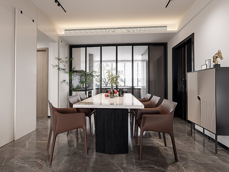 餐厨空间玻璃隔断让视野通透。居家生活时,围坐于此用餐温馨惬意,沉稳又不失温暖。整体品质感十足,精致的摆件与绿植点缀其中,营造出舒适且有格调的用餐环境。