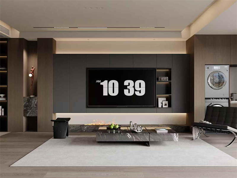 整体布局规整,电视墙收纳与展示功能兼具。色彩以深灰、木色为主,搭配浅灰地毯与暖色灯光,沉稳又柔和。线条简洁,无过多装饰,细节壁炉增添氛围感,整体营造出舒适温馨。