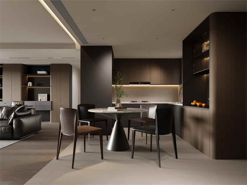 开放式布局让餐厅与客厅、厨房相连,视野通透,连贯性更强。圆桌围坐用餐更惬意,色彩以沉稳深棕搭配浅灰,营造出温馨又有质感的氛围。简洁线条搭配实用定制设计,尽显舒适与时尚。