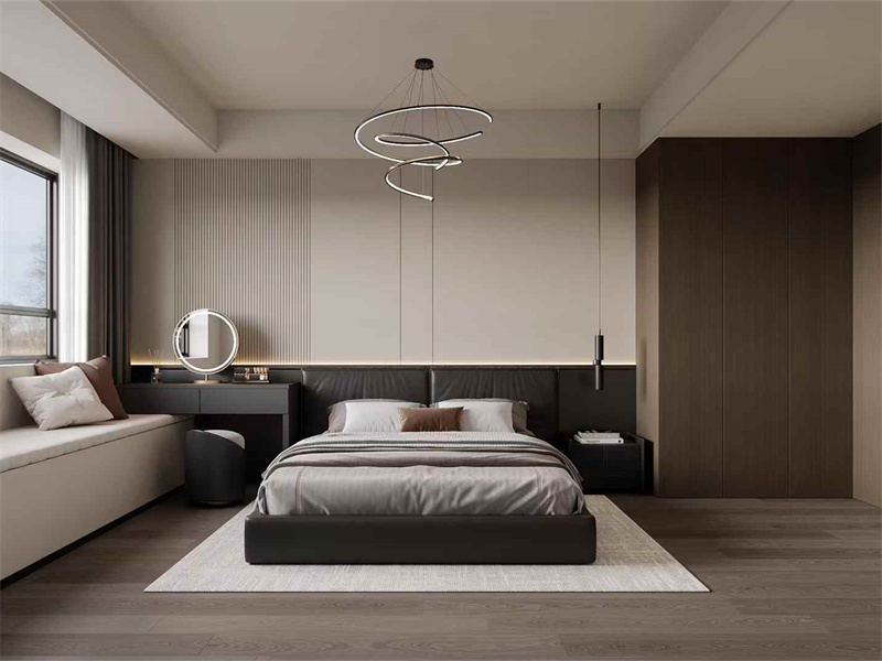 卧室空间设计合理,一侧是带梳妆功能的定制设计,窗边飘窗提升惬意舒适氛围,另一侧有收纳衣柜。以灰、棕、白为主,沉稳又温馨,打造出放松的睡眠空间。