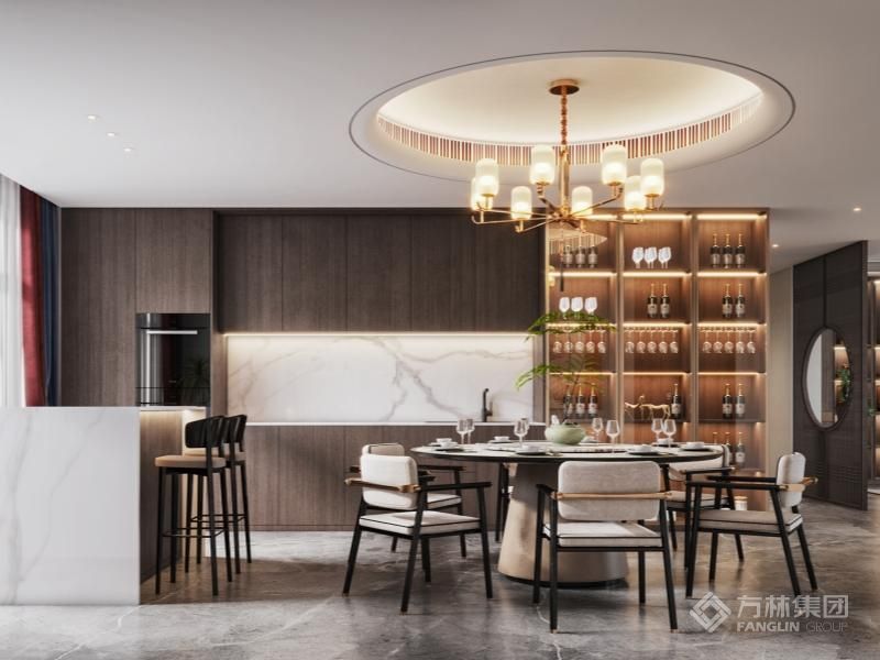 以雅致东方风格为主导,打造尊贵雅致、体现东方人文内涵的空间。使用功能的重新定义是室内设计的关键,设计师将空间规划为西厨岛台区及会客厅,这里既是日常起居及休闲区域,也可以满足主人社交会客的需求。山水纹理、艺术屏风、写意的画作,东方意境塑造出独特的美学体验。化繁为简,演绎现代东方风尚。空间光影艺术之美与当代东方陈设之美,充满律动,带来优雅舒适的感官体验。