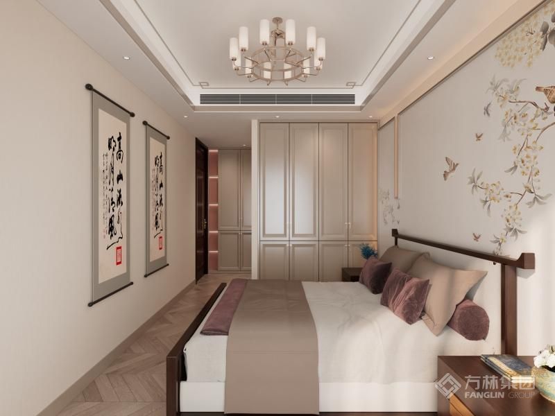 床头背景墙半围合式,对称的设计手法,大气秀丽。饰以梅花,搭配两组古典灯具,新中式卧具,呈现出一个娟秀素雅且文化气息浓郁的空间